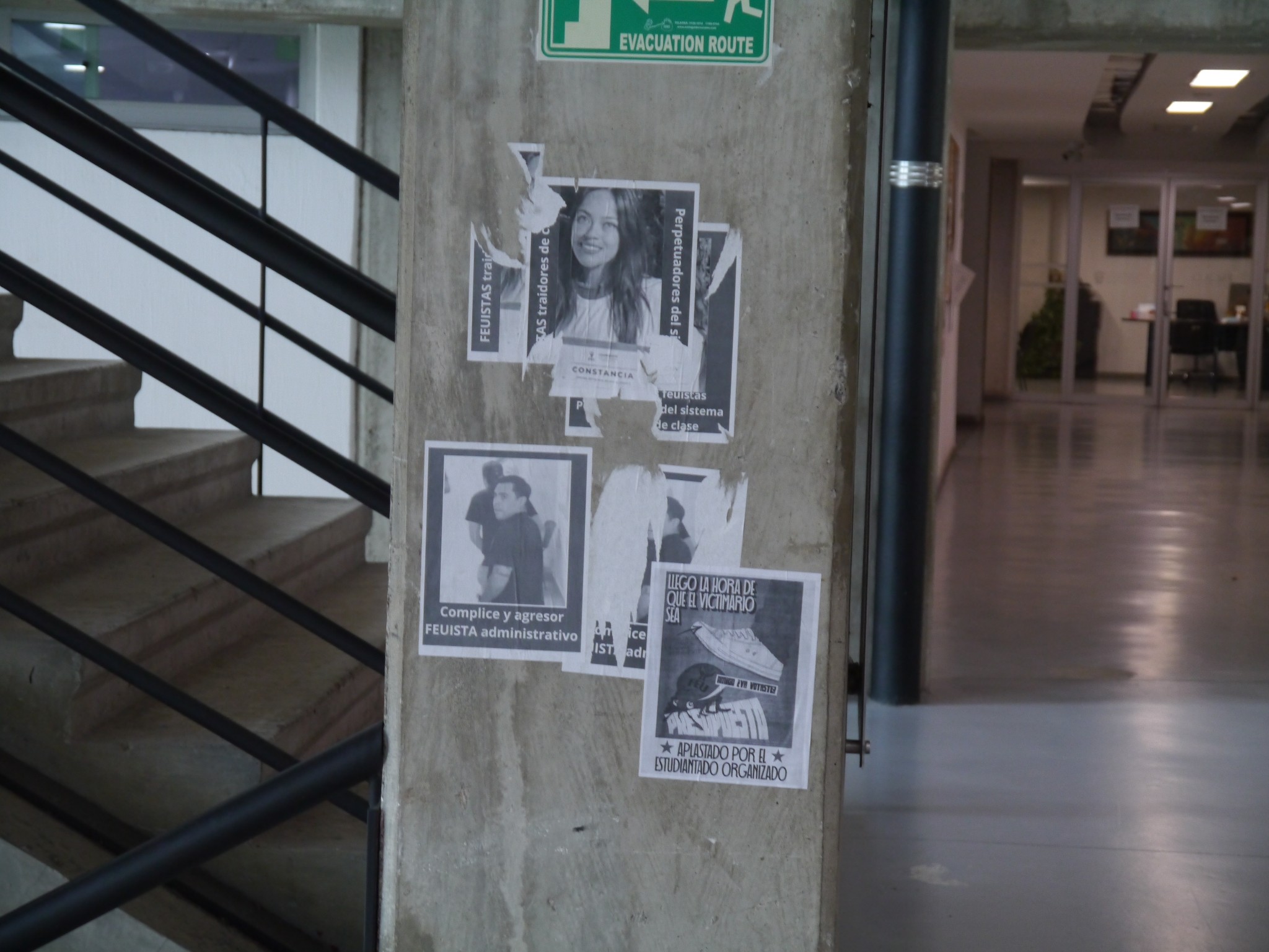 Fue alrededor de las 10:25 a.m., en el edificio E, segunda planta, donde comenzaron retirando los carteles de una columna. Nuestro director, Mario, salió a documentar lo ocurrido, este no dijo nada, no cuestionó el hecho, solo se limitó a observar y registrar cómo desaparecían los mensajes del estudiantado.